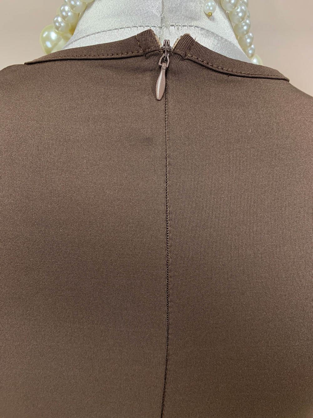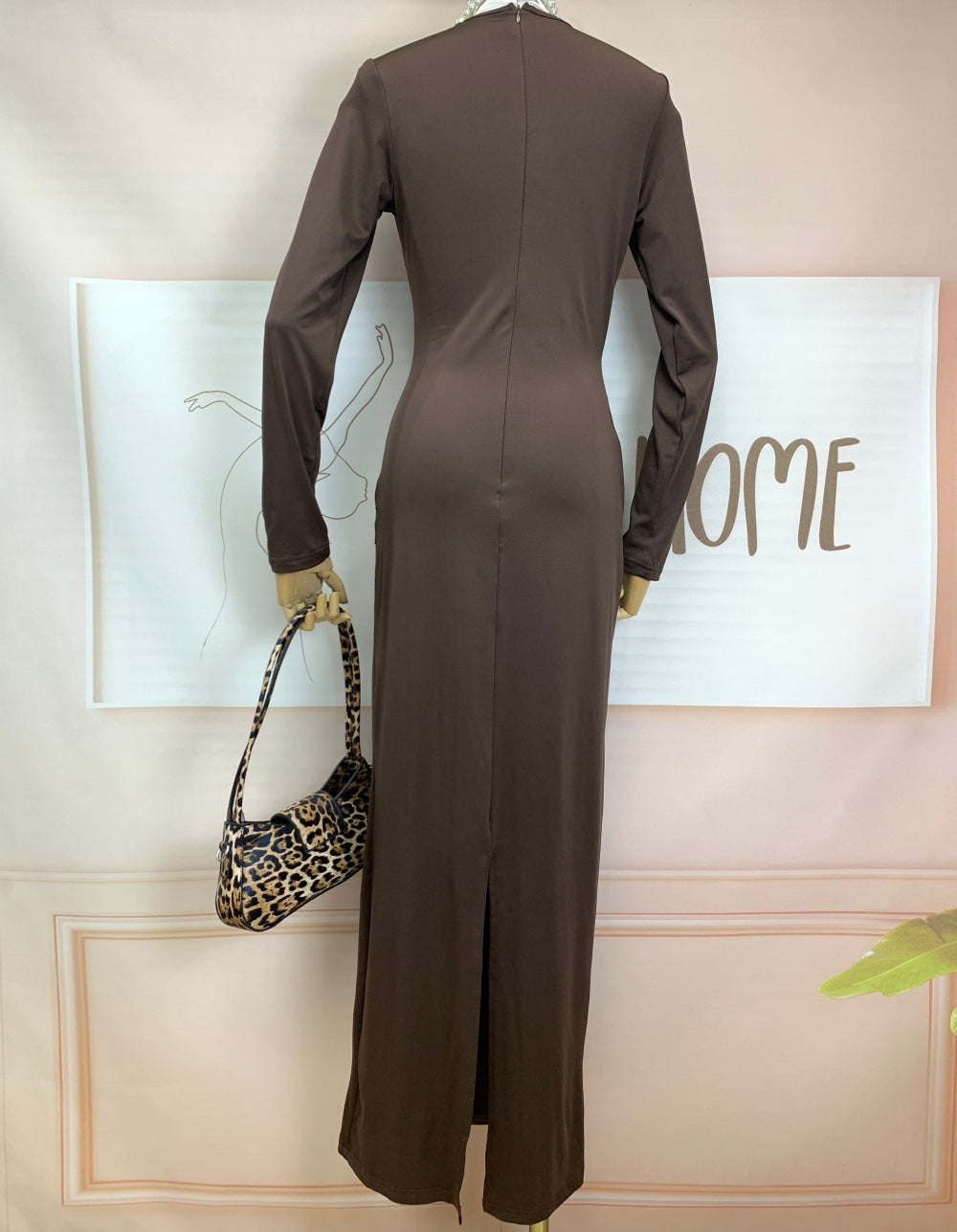 Details: Long sleeve maxi dress with gold-tone circular embellishments at shoulder and hip, side ruched gathering, back slit hem