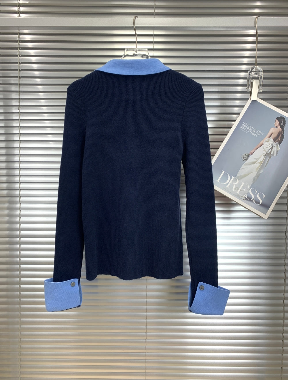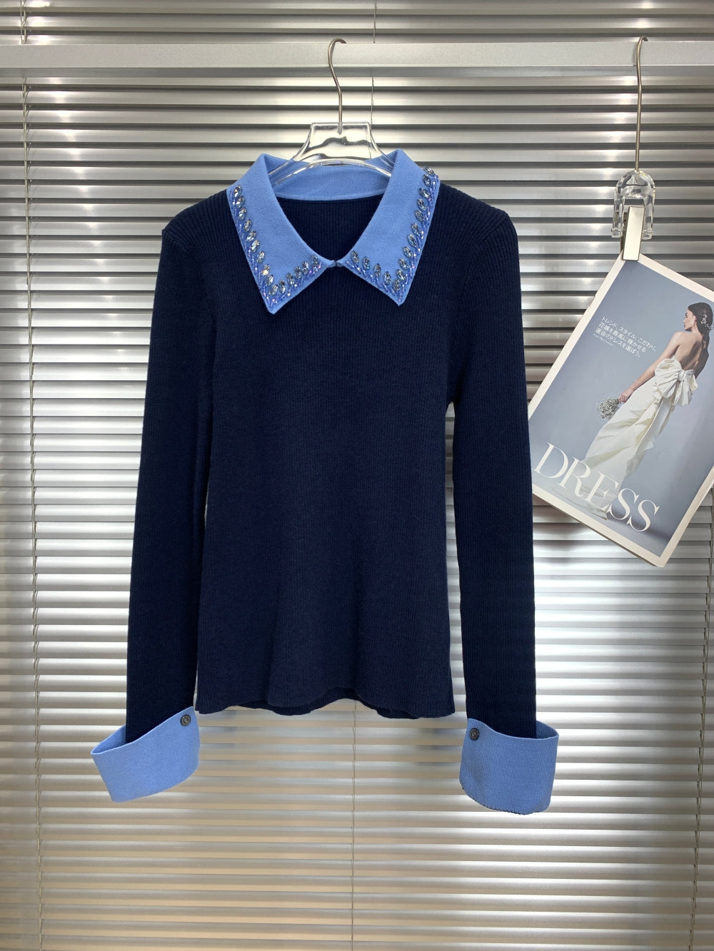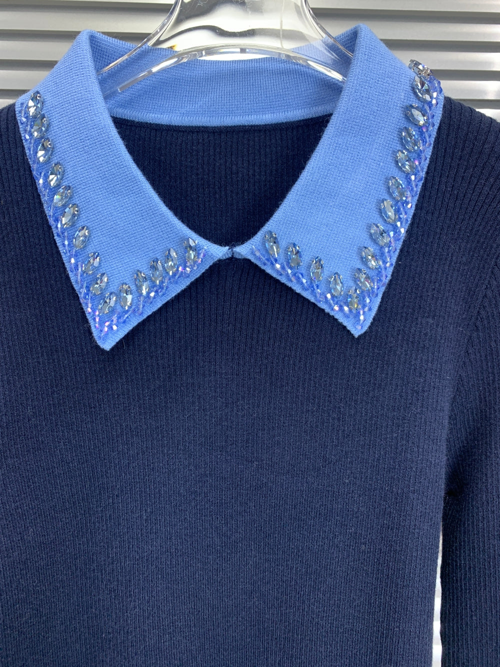 Details: Navy ribbed knit body with light blue collar and cuffs, rhinestone embellishments along collar edge