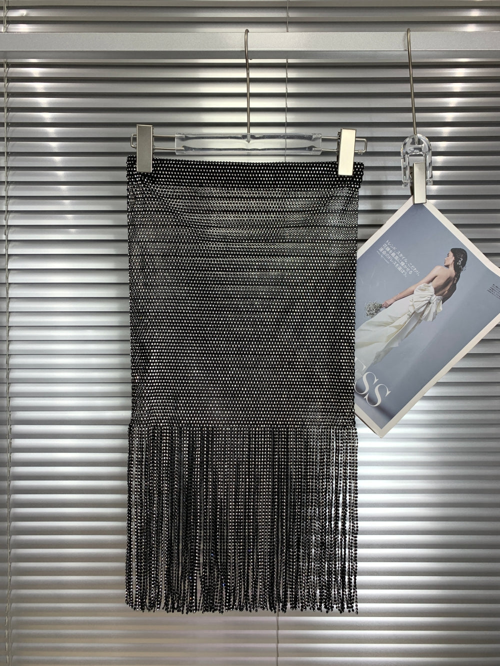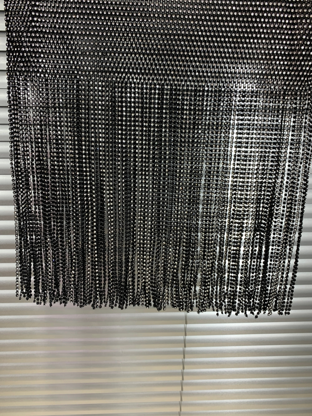 Details: Long crystal fringe, high-shine metal mesh