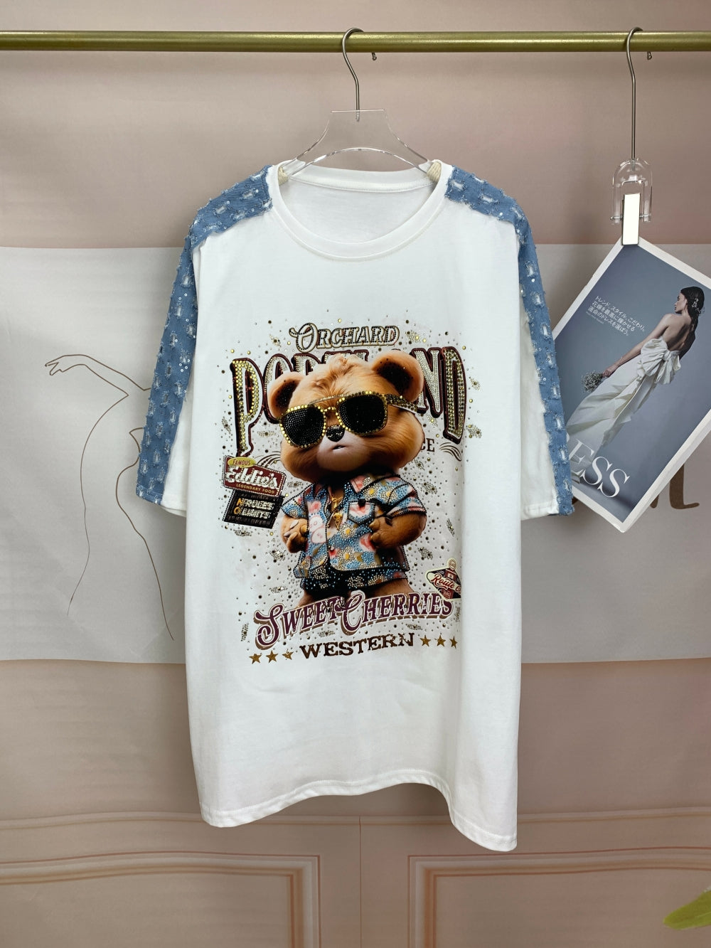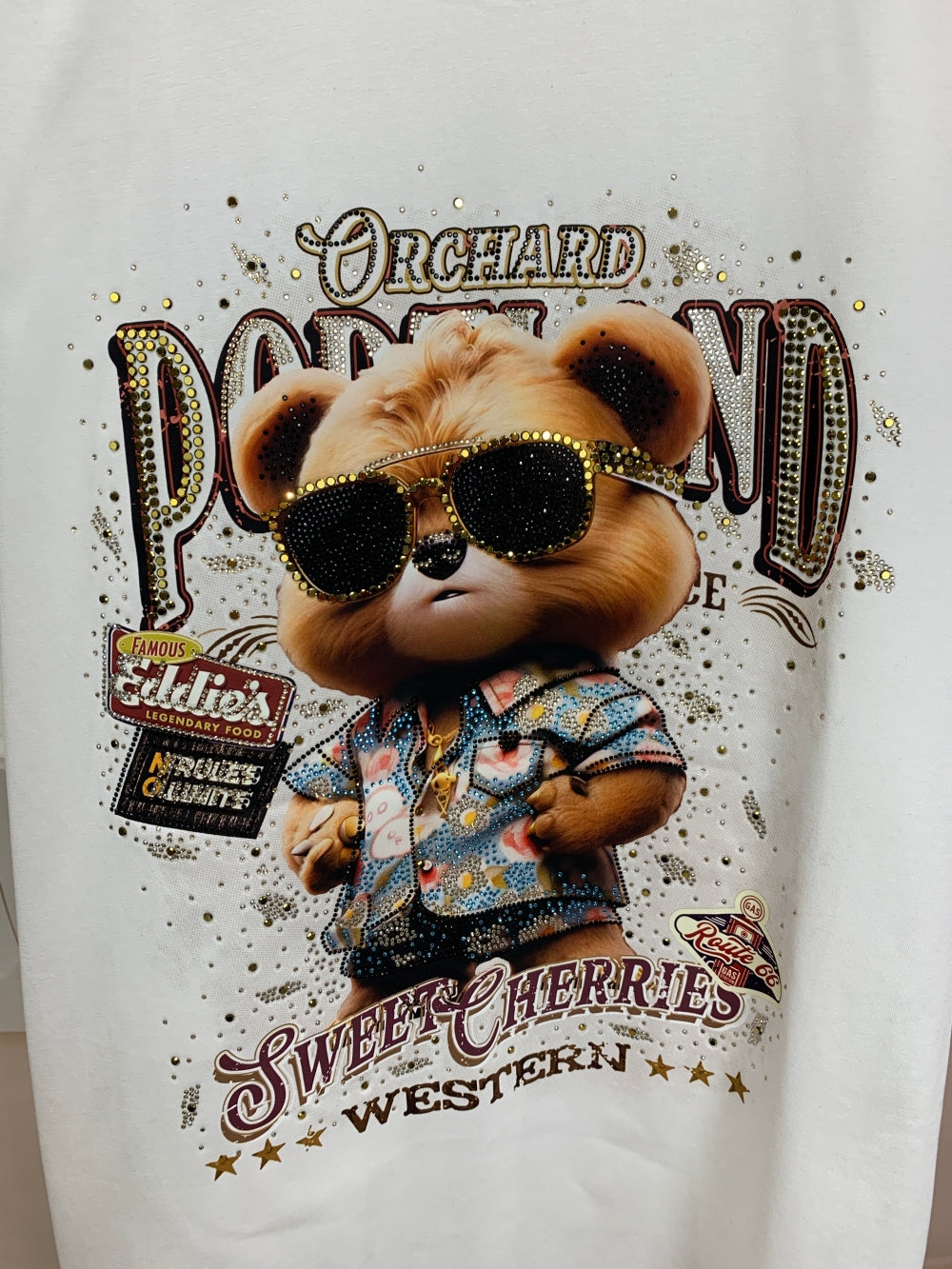 Details: Bear graphic with rhinestone accents, round neckline, short sleeves