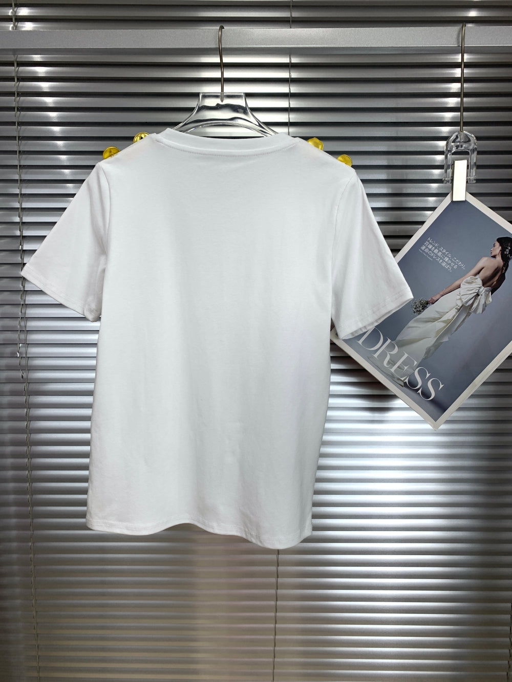 Details: Decorative gold-tone shoulder buttons, round neckline