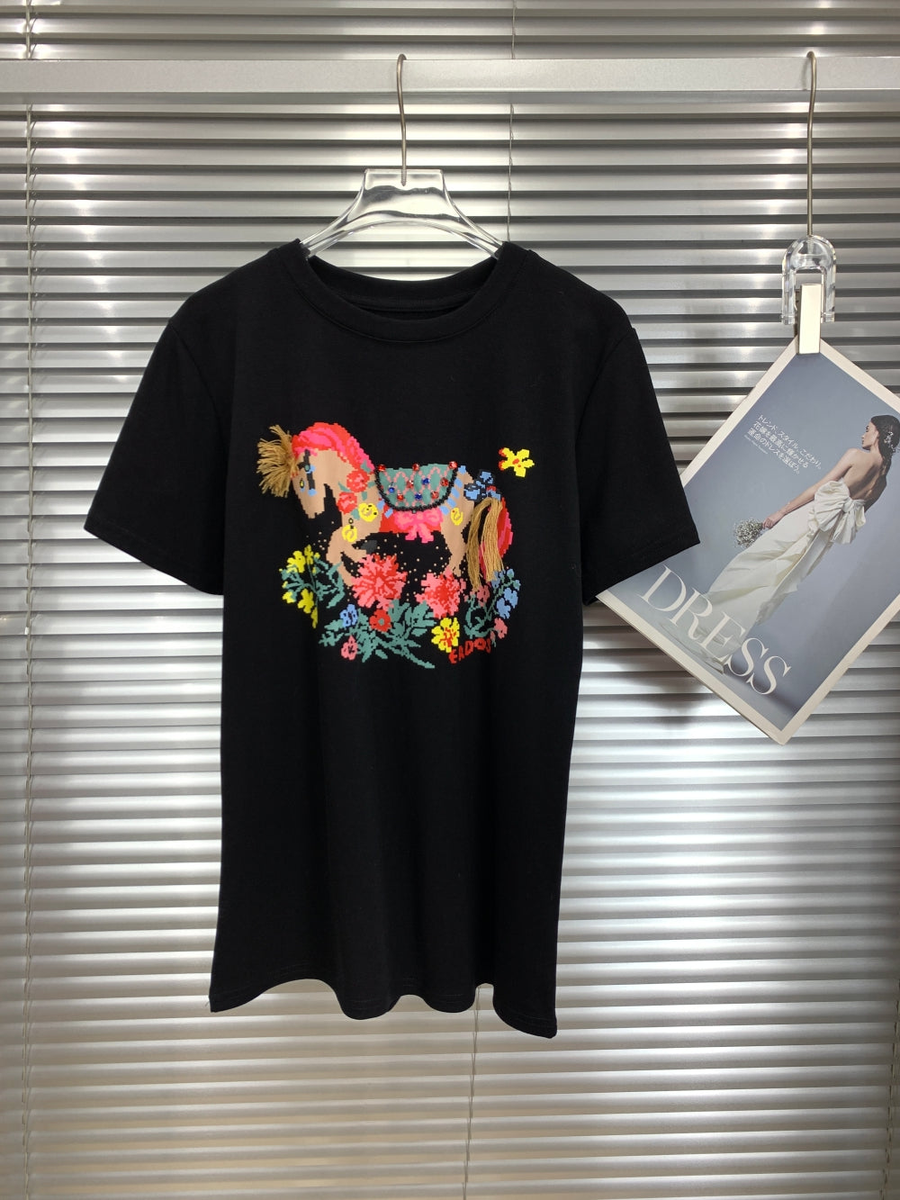 Details: Horse and floral print, round neckline, short sleeves
