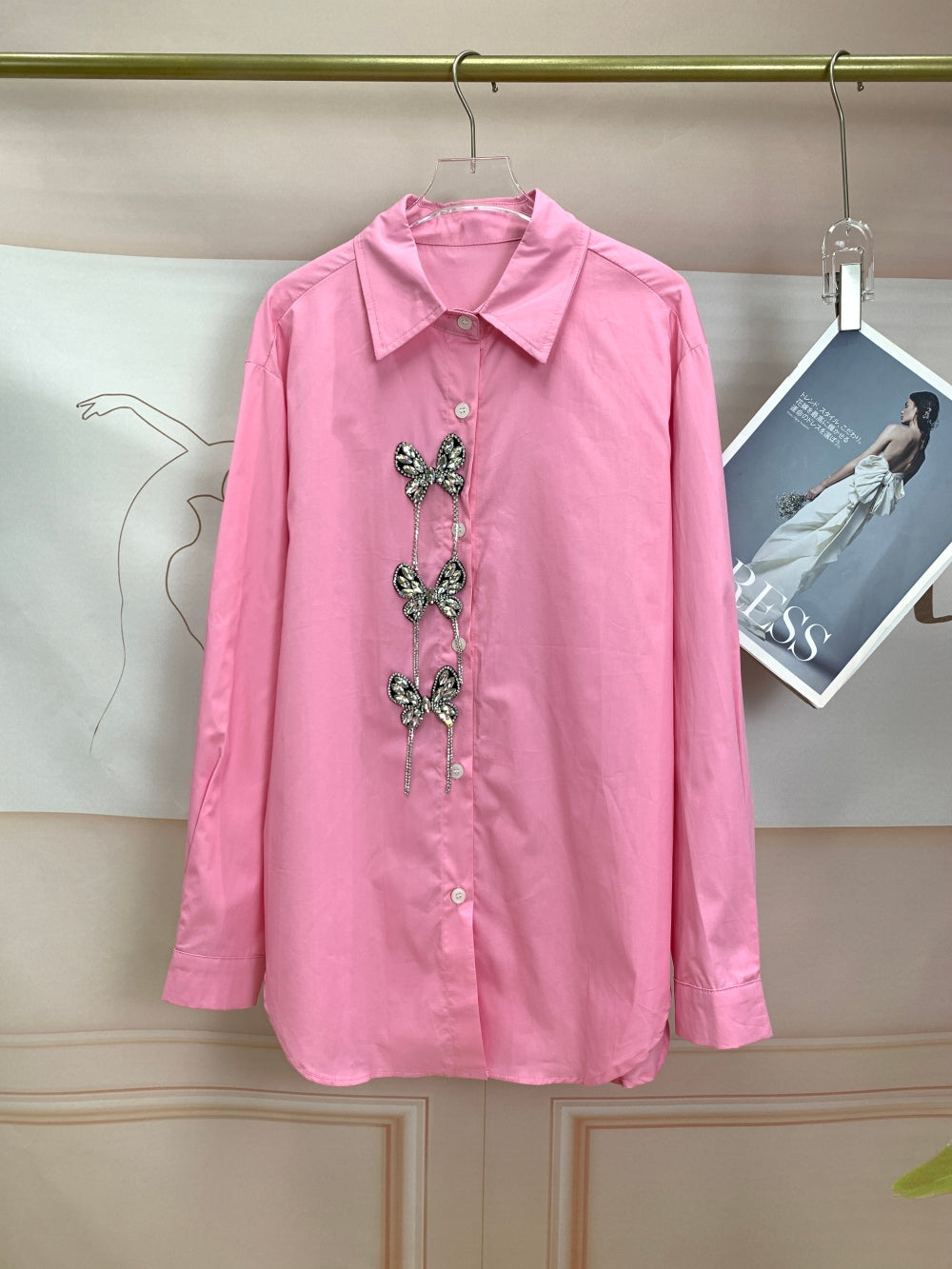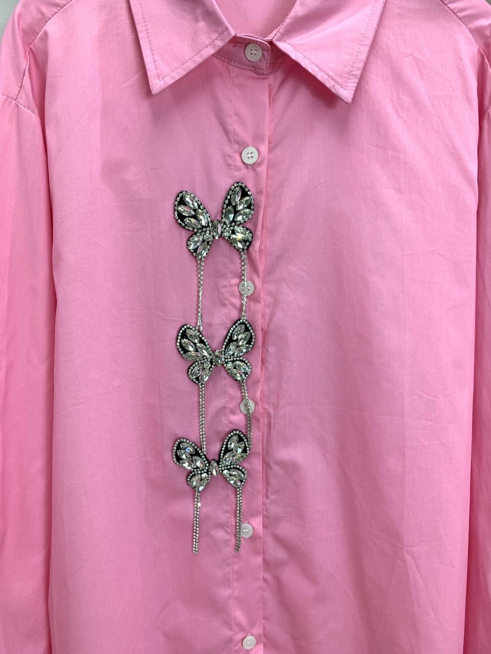 Details: Rhinestone butterfly embellishments down the front, classic collar, button closure