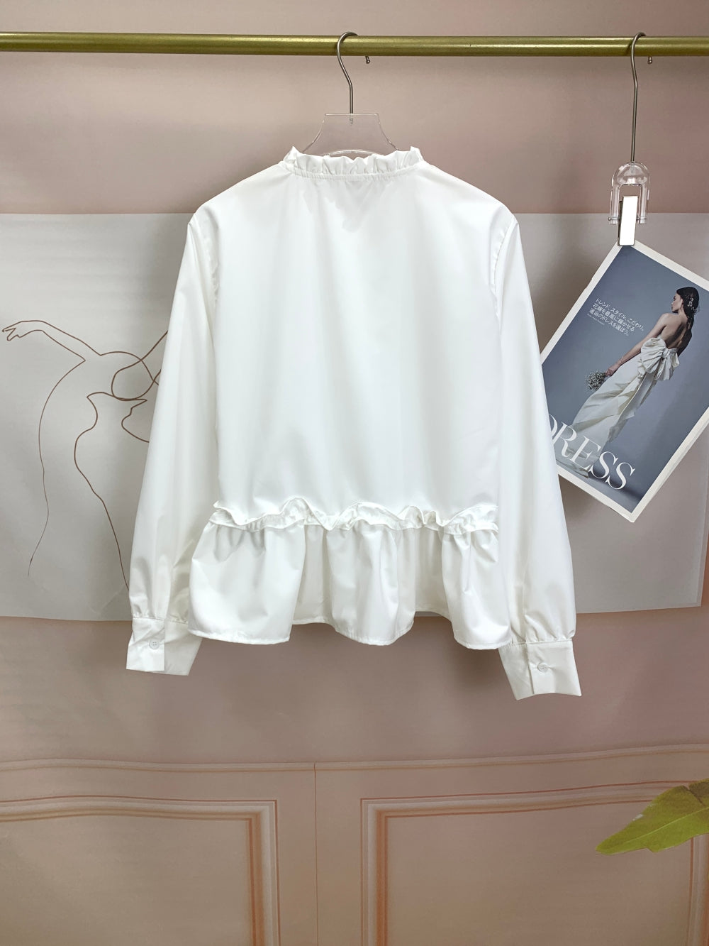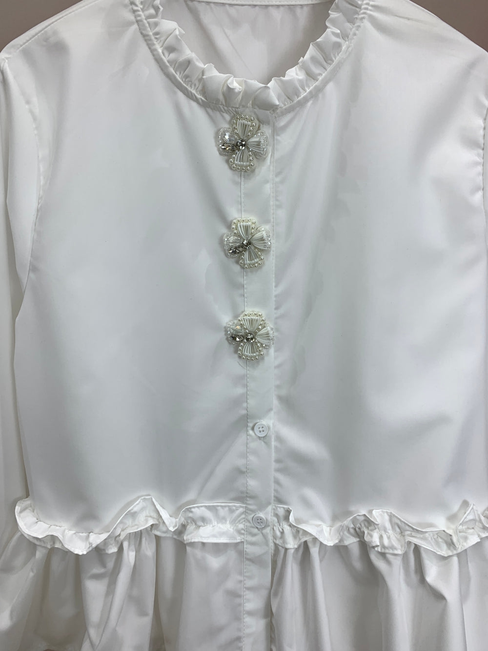 Details: Ruffled waist seam, decorative buttons, long sleeves