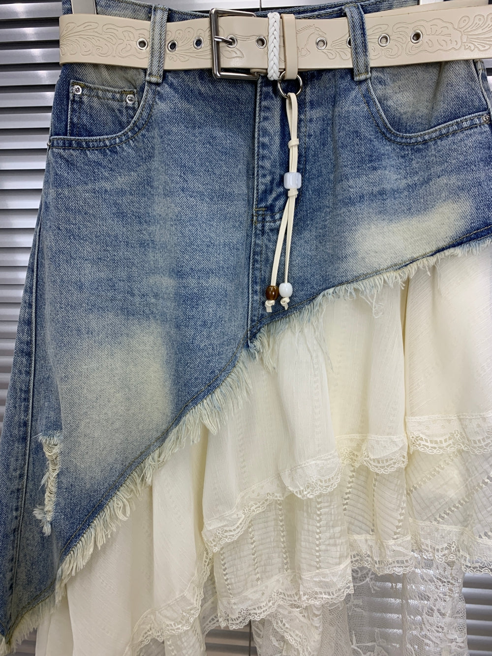 Details: Asymmetrical denim overlay, layered lace hem, distressed edge, belt included
