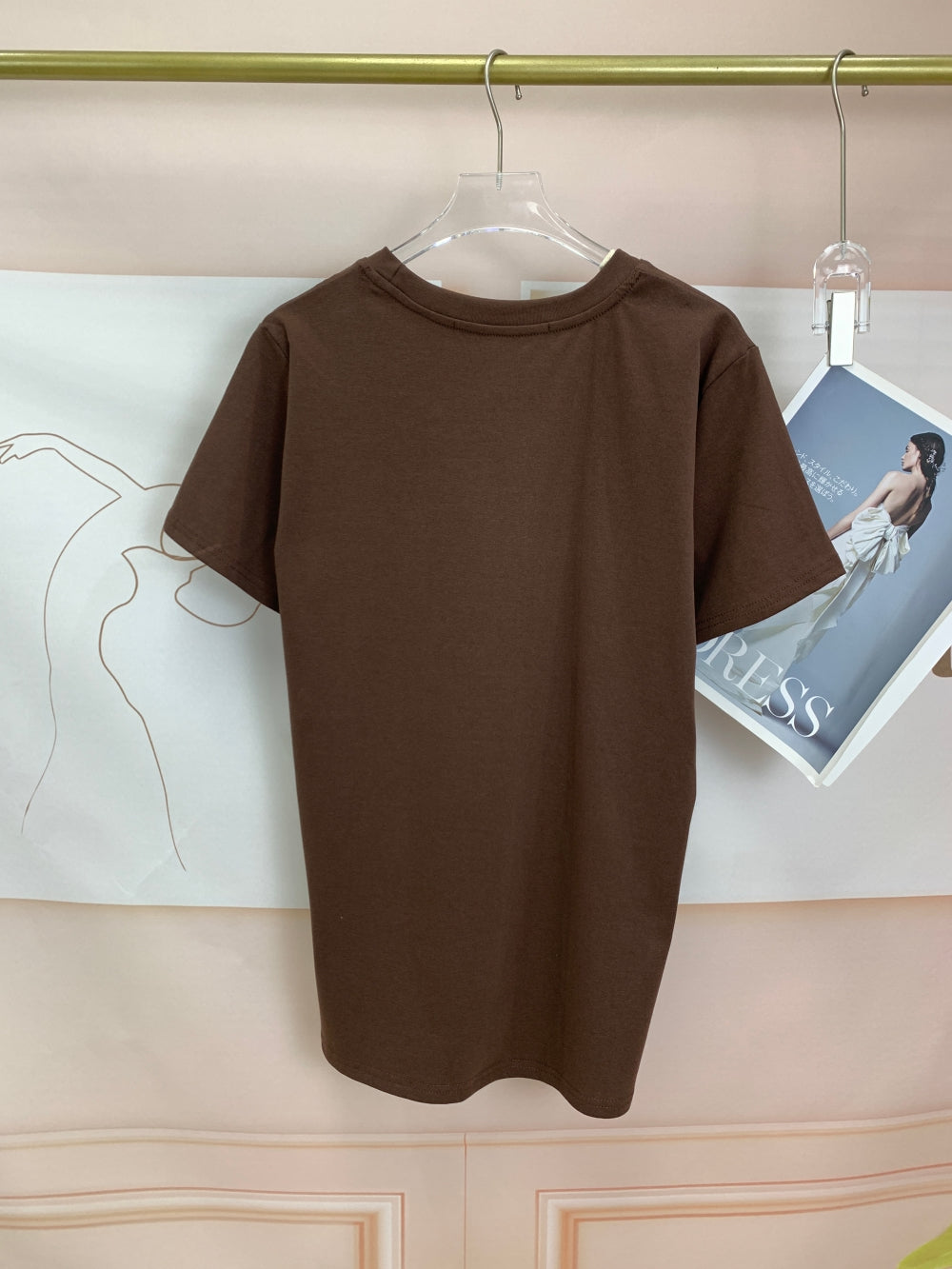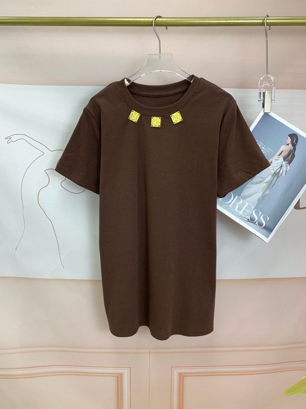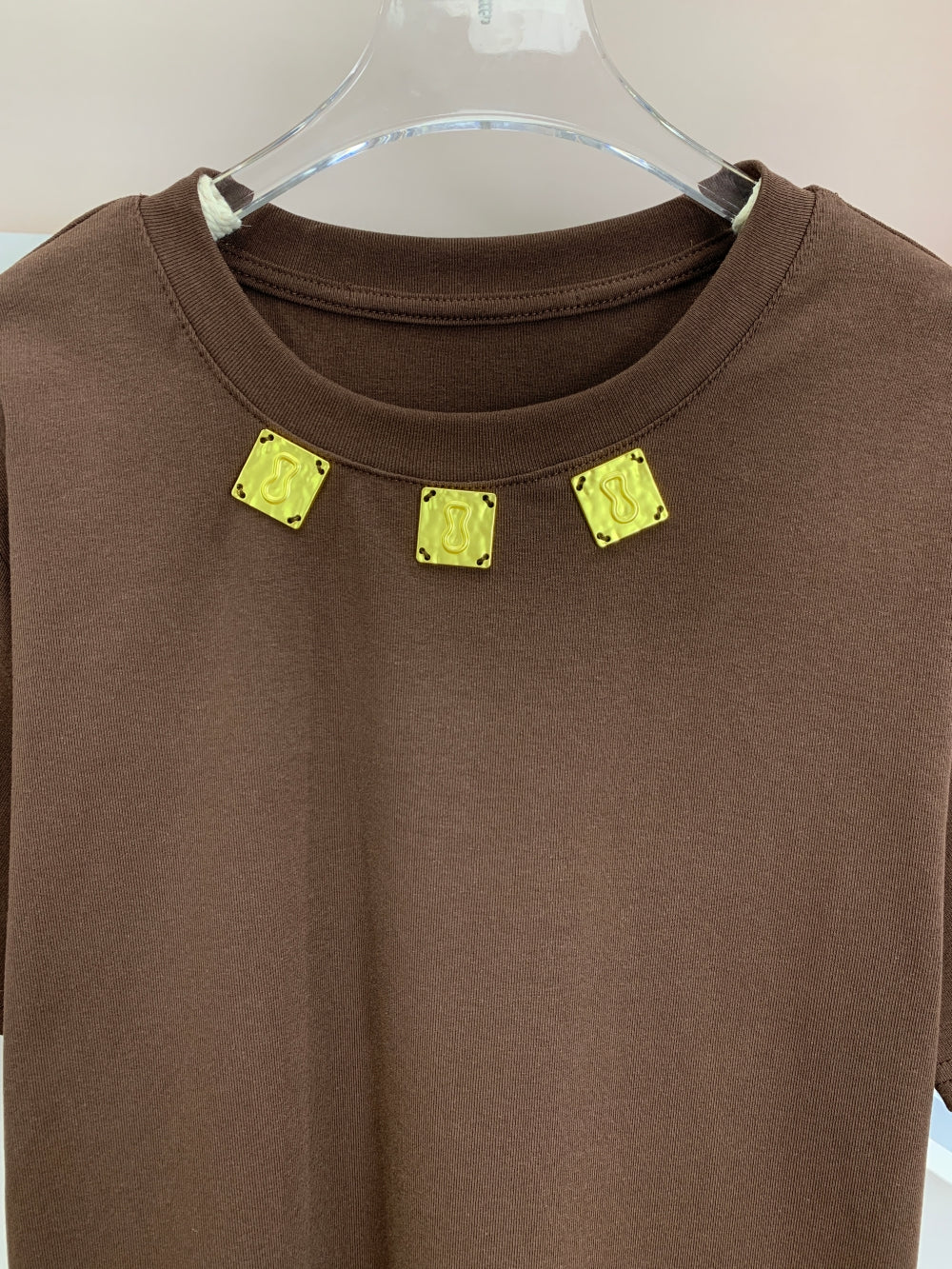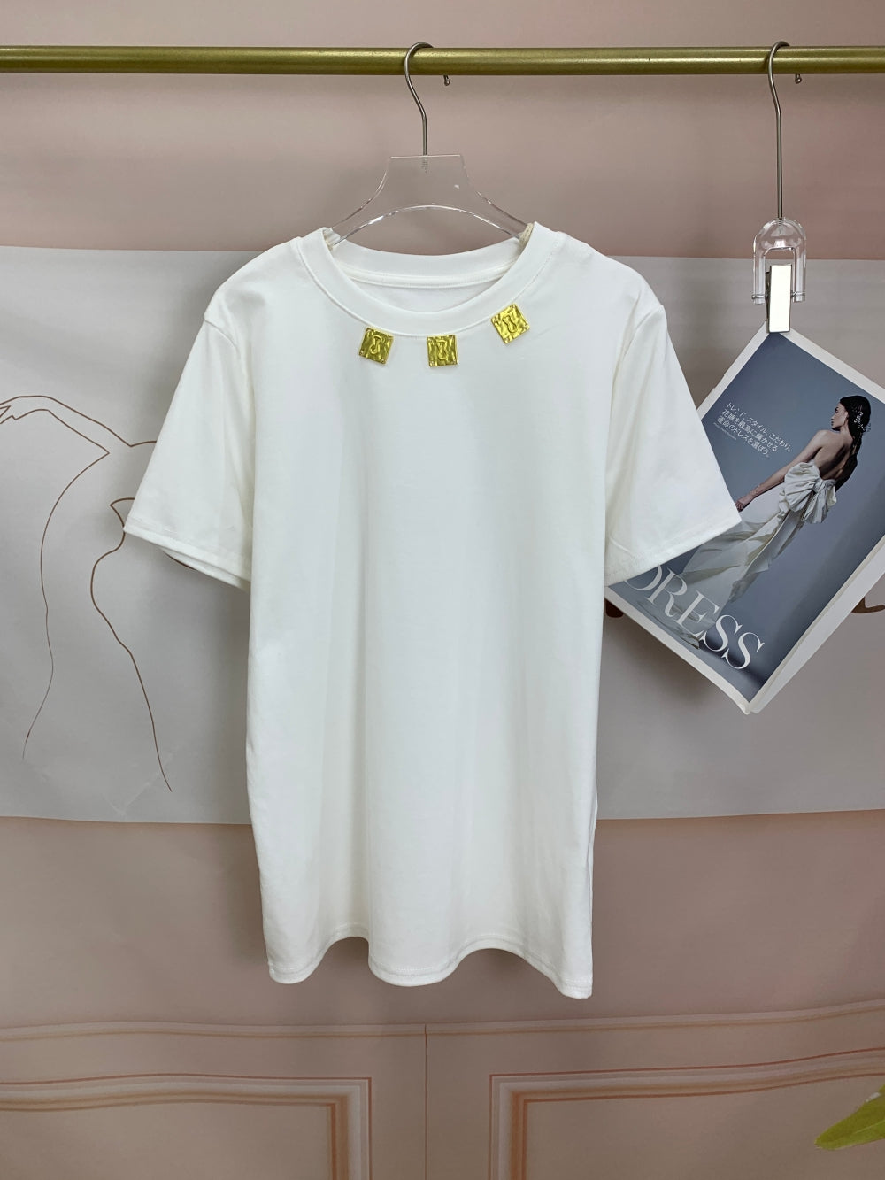 Details: Crew neck, short sleeves, gold charm neckline embellishment