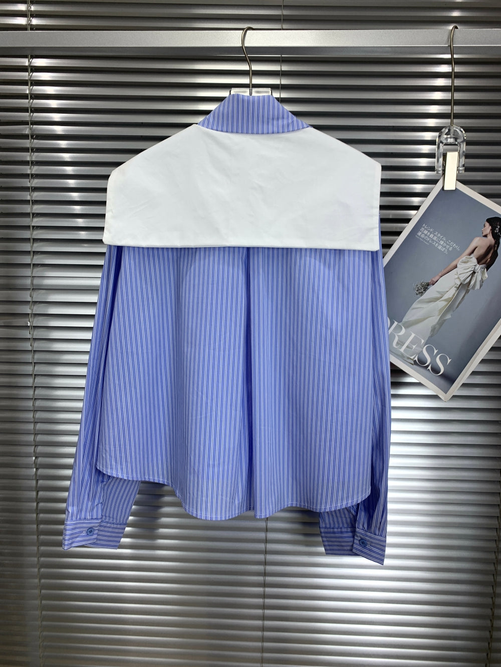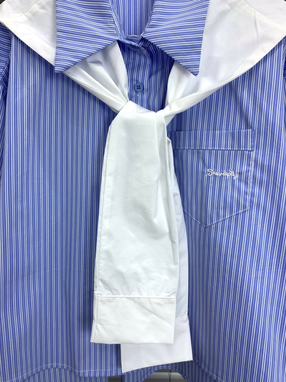 Details: Oversized sailor collar, attached white scarf/tie detail, chest pocket