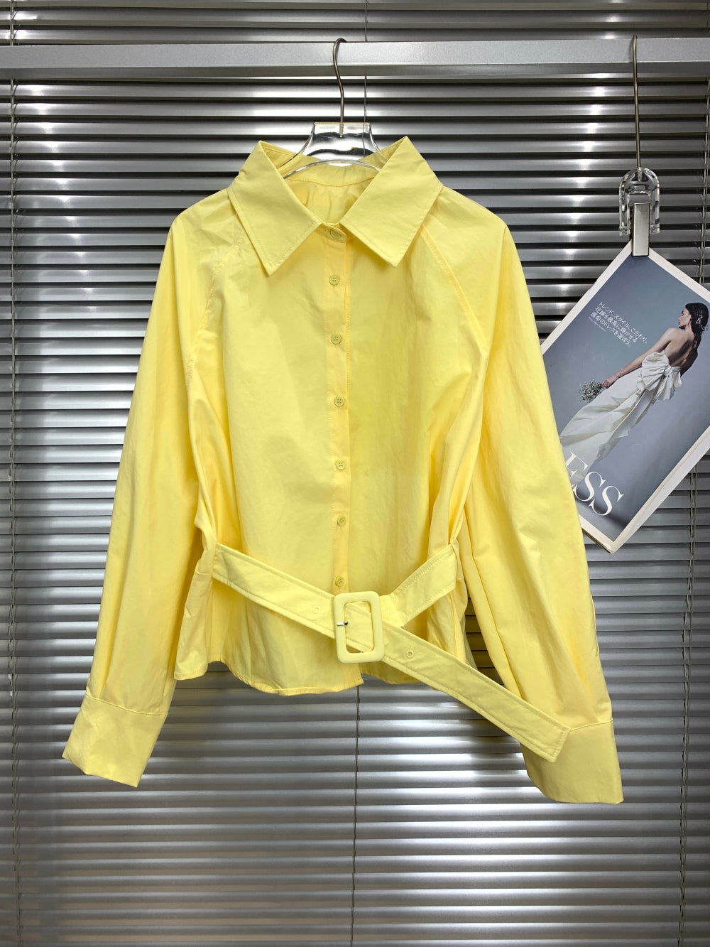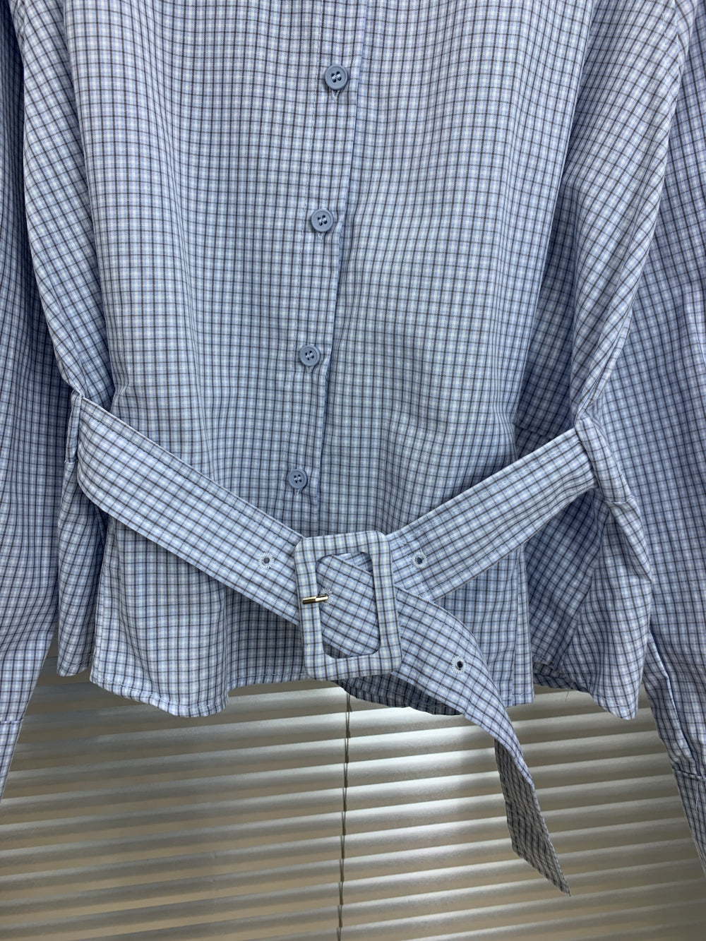 Details: Waist belt included, button front, shirt collar, long sleeves
