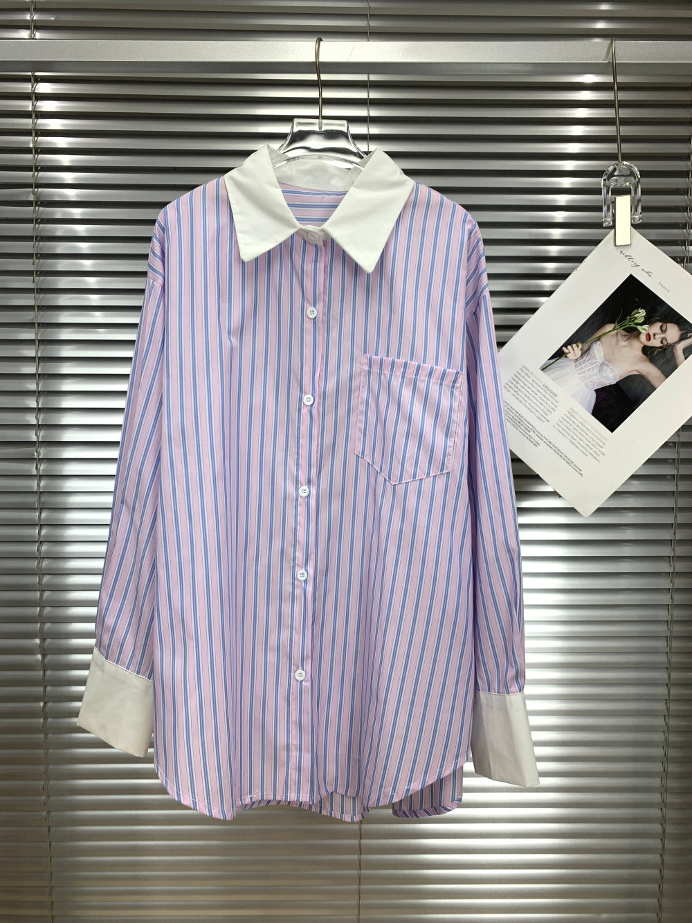 Details: Contrast white collar & cuffs, front chest pocket, button-down closure