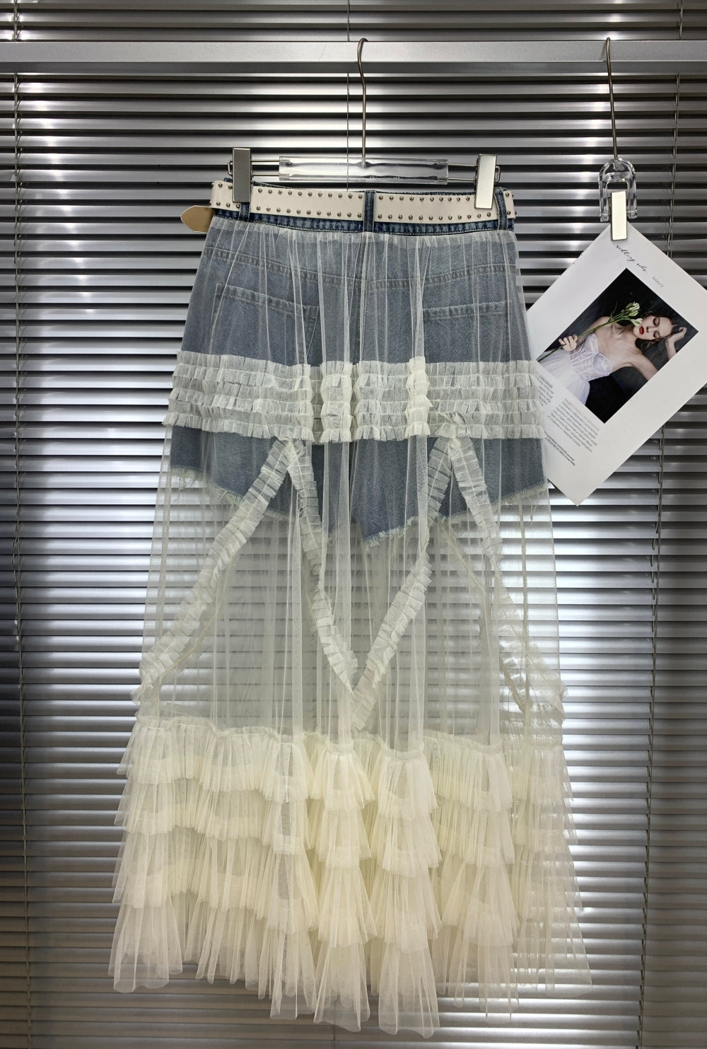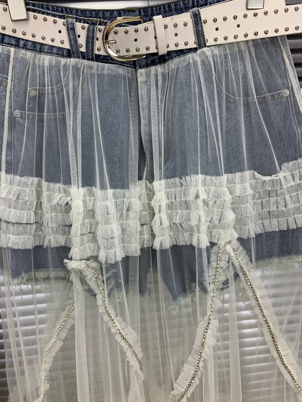 Details: Denim waistband, tiered ruffle tulle panels, pearl chain drape, comes with studded belt