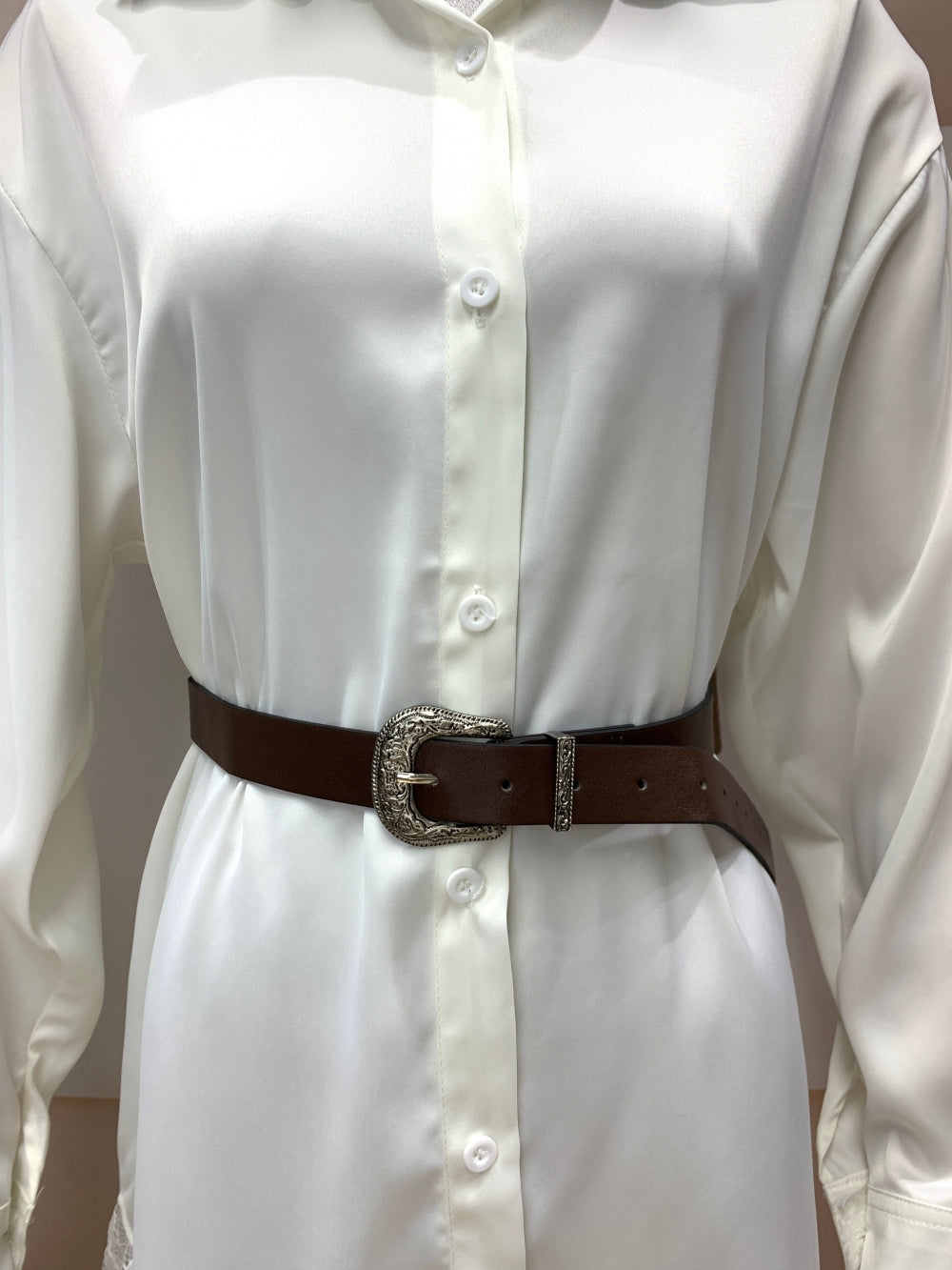 Details: Button-down front, lace hem & cuff trim, detachable belt