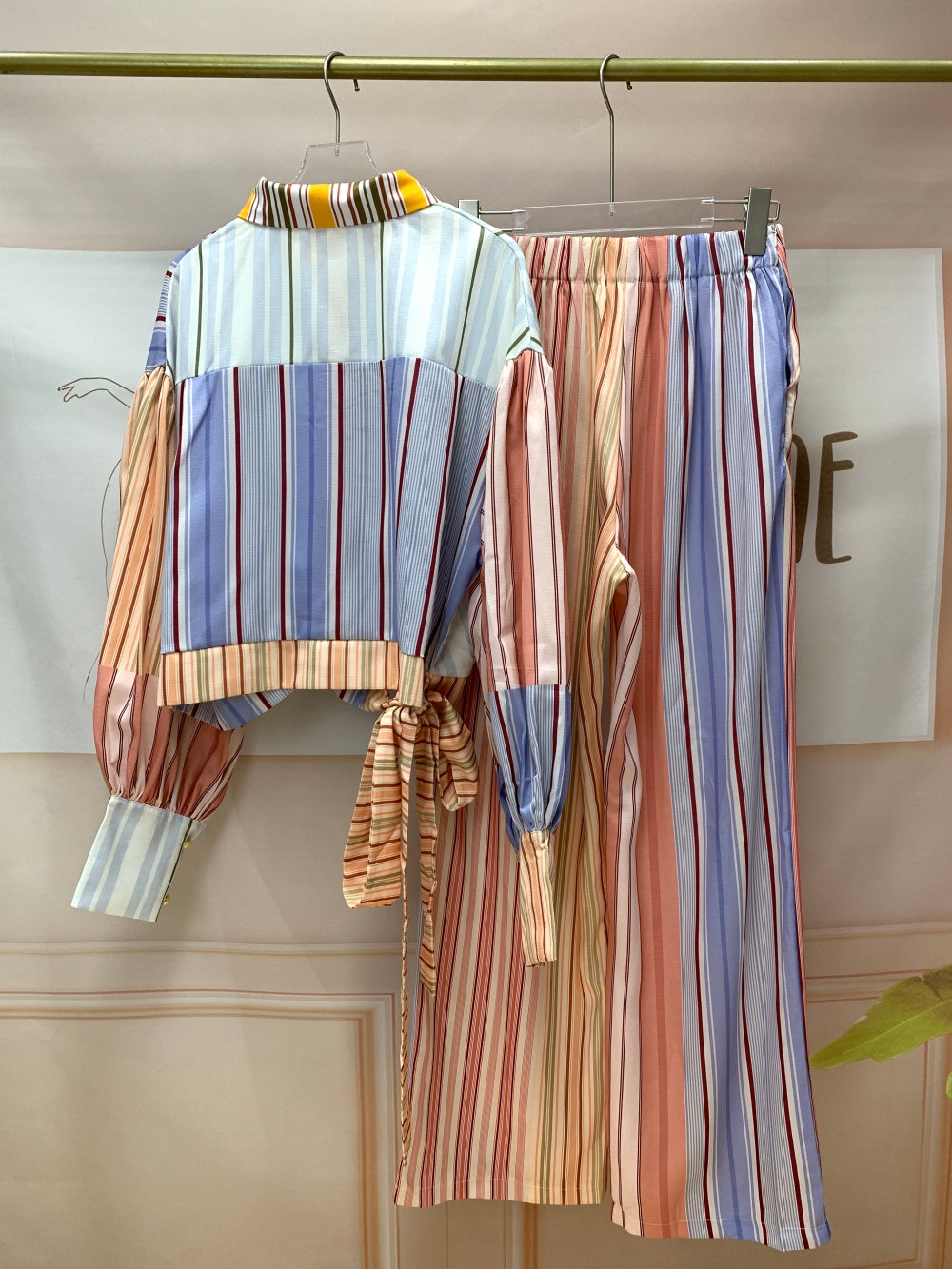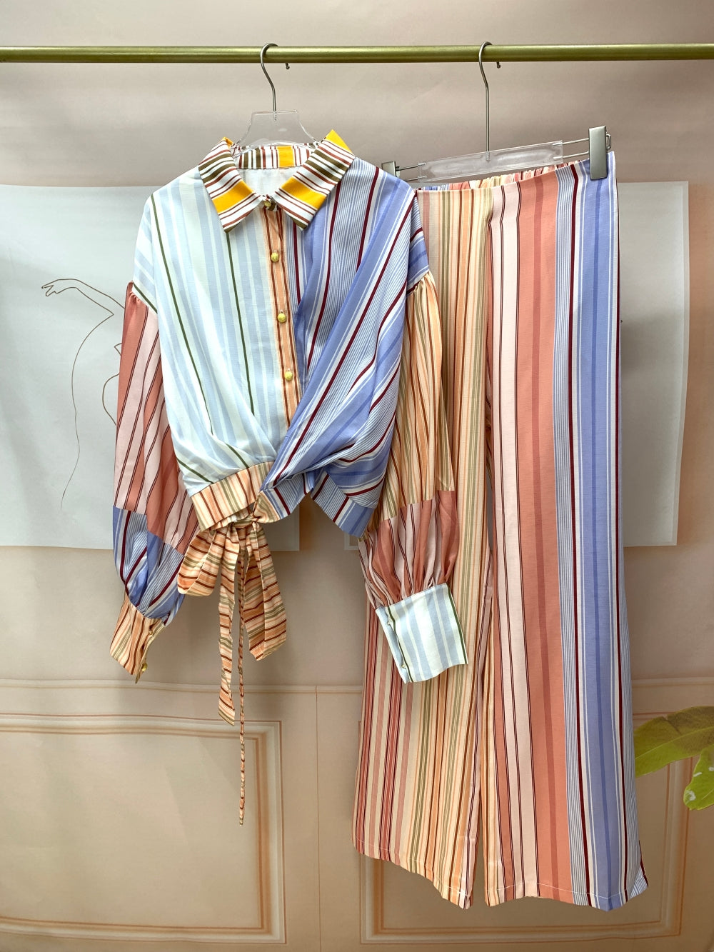 Details: Wrap-style blouse with tie waist, wide-leg matching skirt/pants, contrast collar