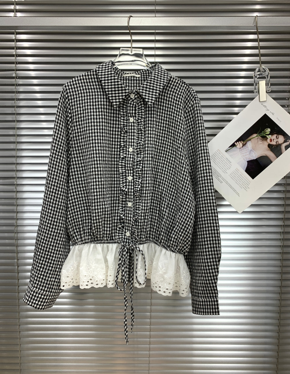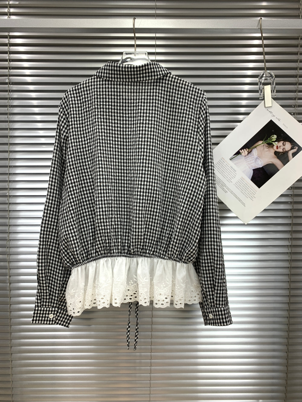 Details: Button-down front, ruffle placket, contrast eyelet lace hem, adjustable waist tie