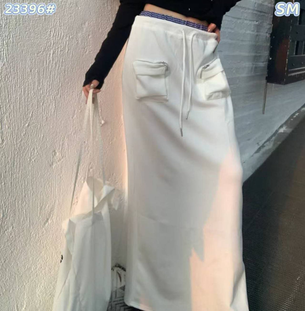 Details: Front flap pockets, drawstring waist, back slit