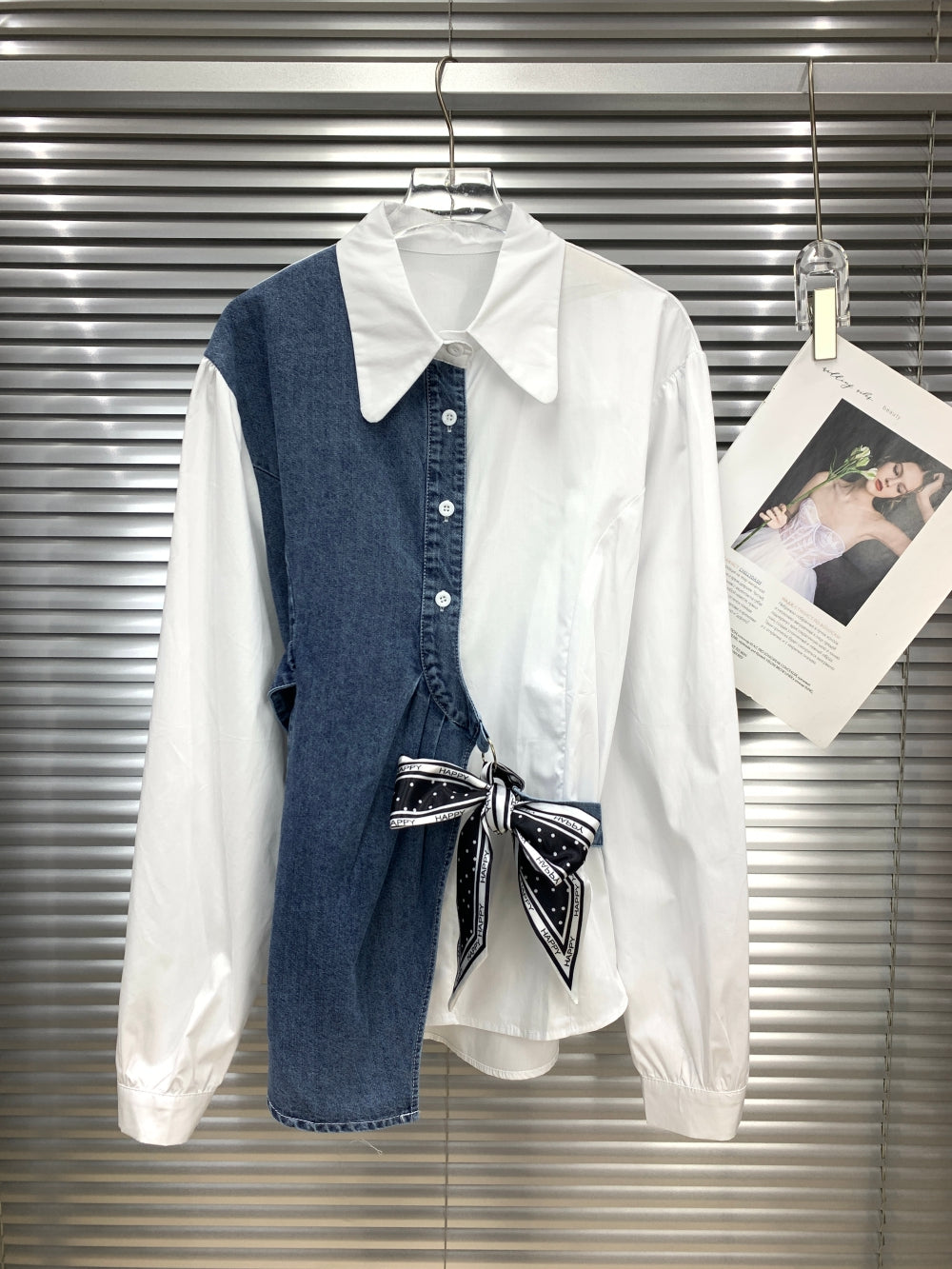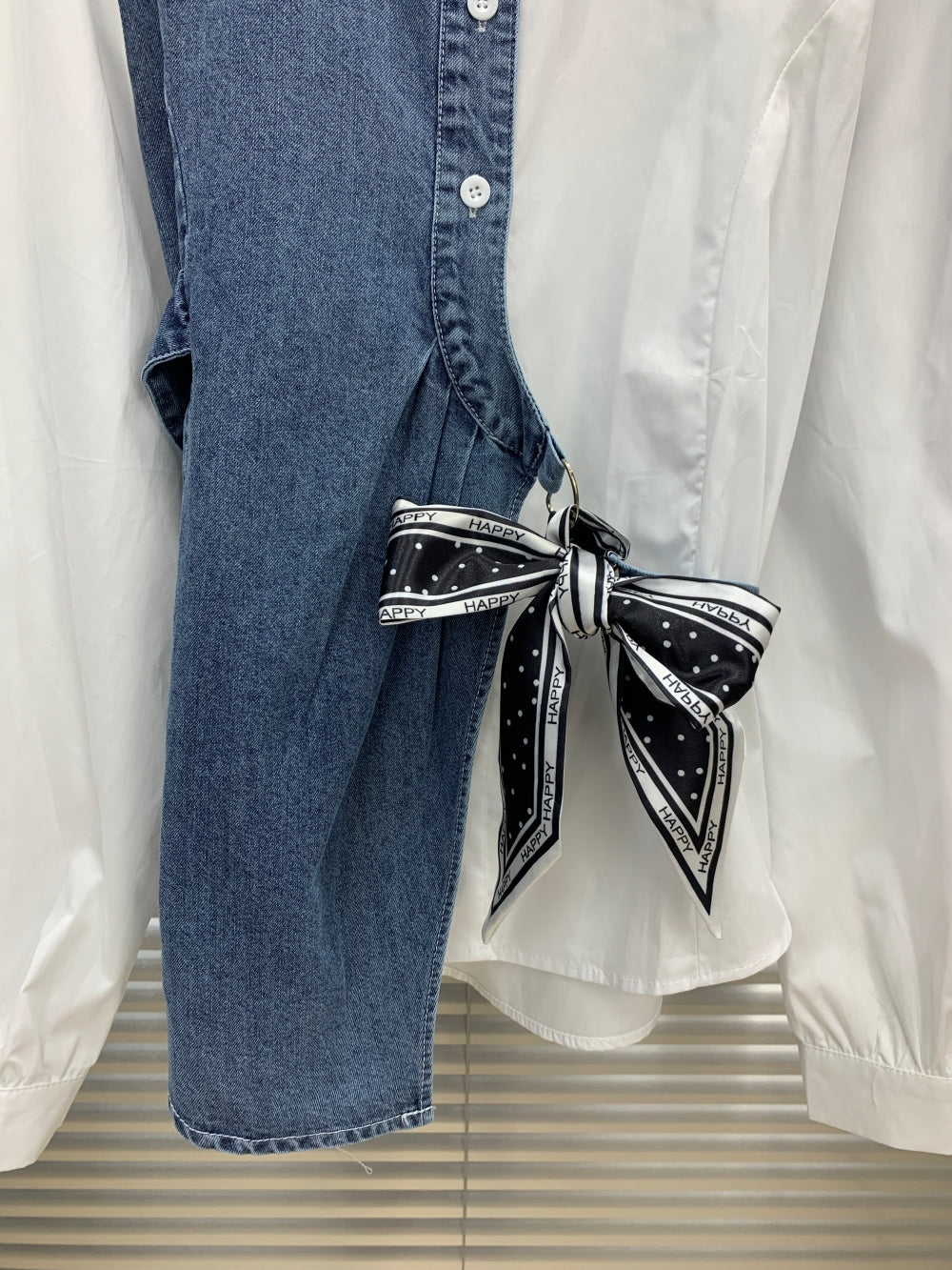 Details: A striking asymmetric design featuring a denim half-panel, pointed collar, and a charming polka-dot bow waist tie.