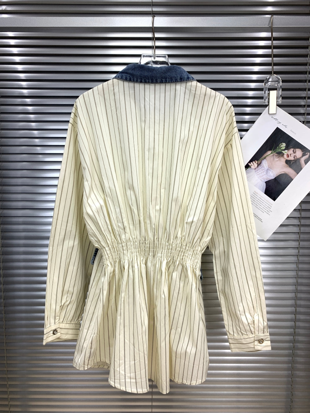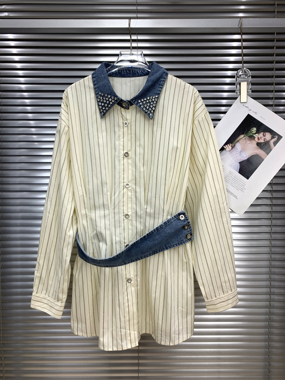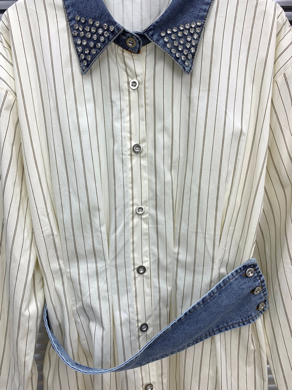 Details: Elevated with a crystal-embellished denim collar and a unique asymmetric denim waist-strap accent.