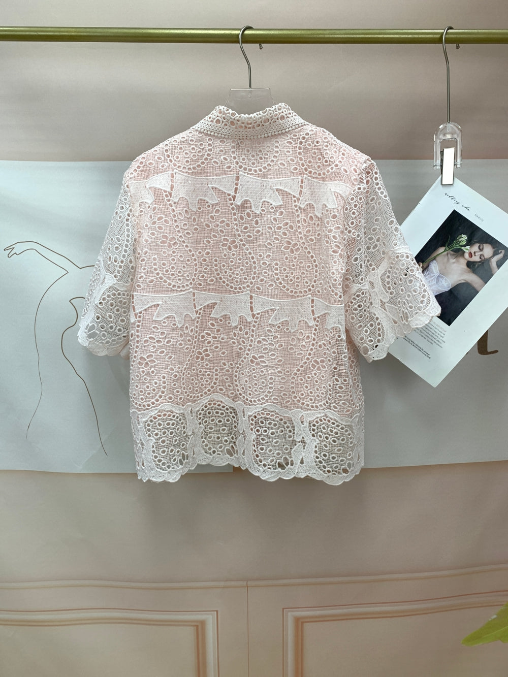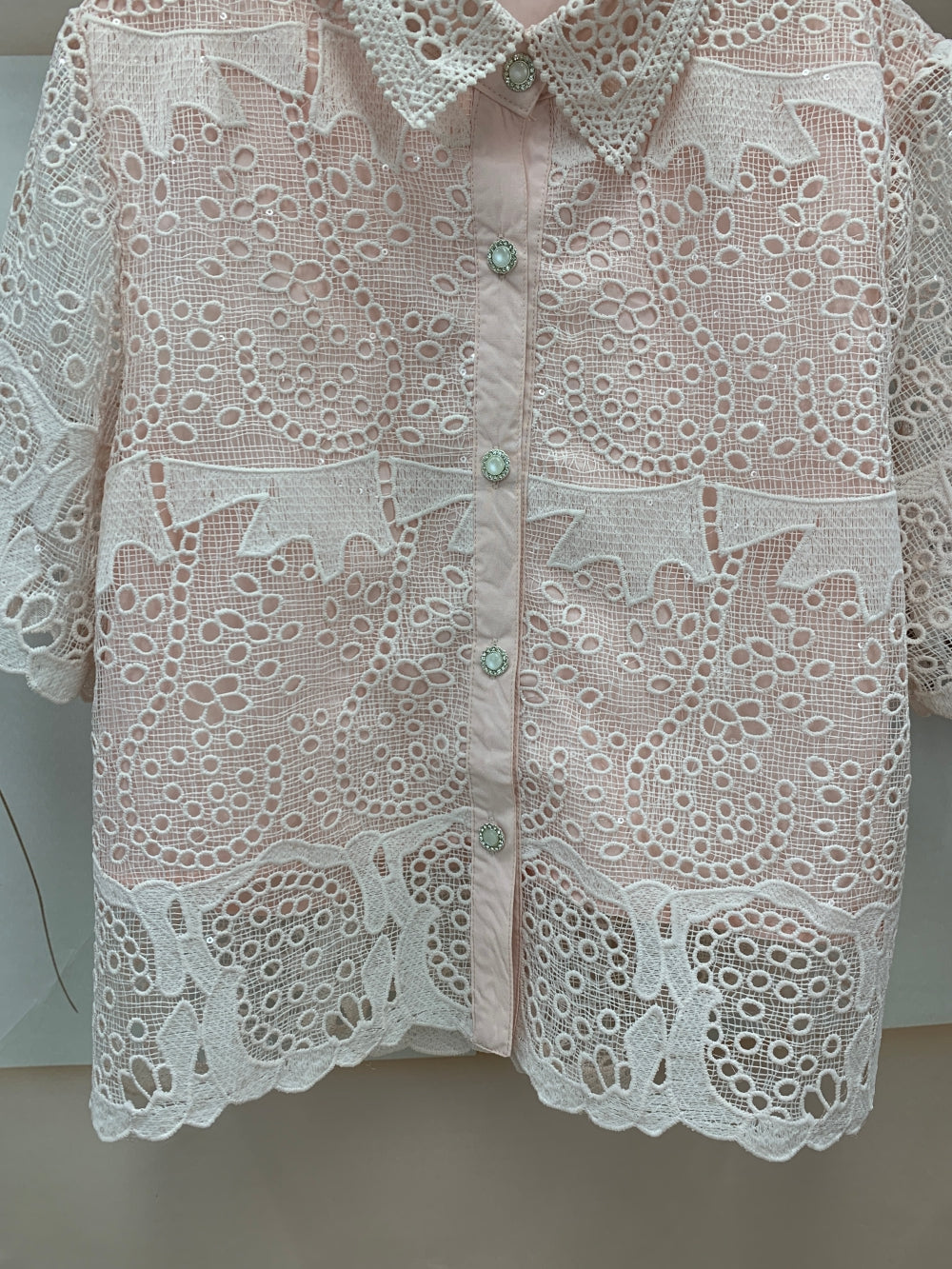 Details: Scalloped lace edges, button front, sheer overlay with inner lining panel