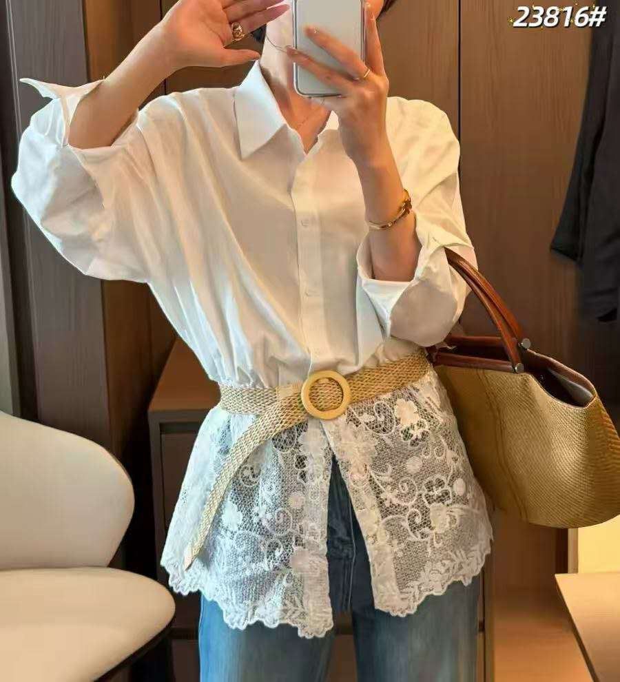 Lace Panel Belted Shirt TopMaterial: Cotton Blend